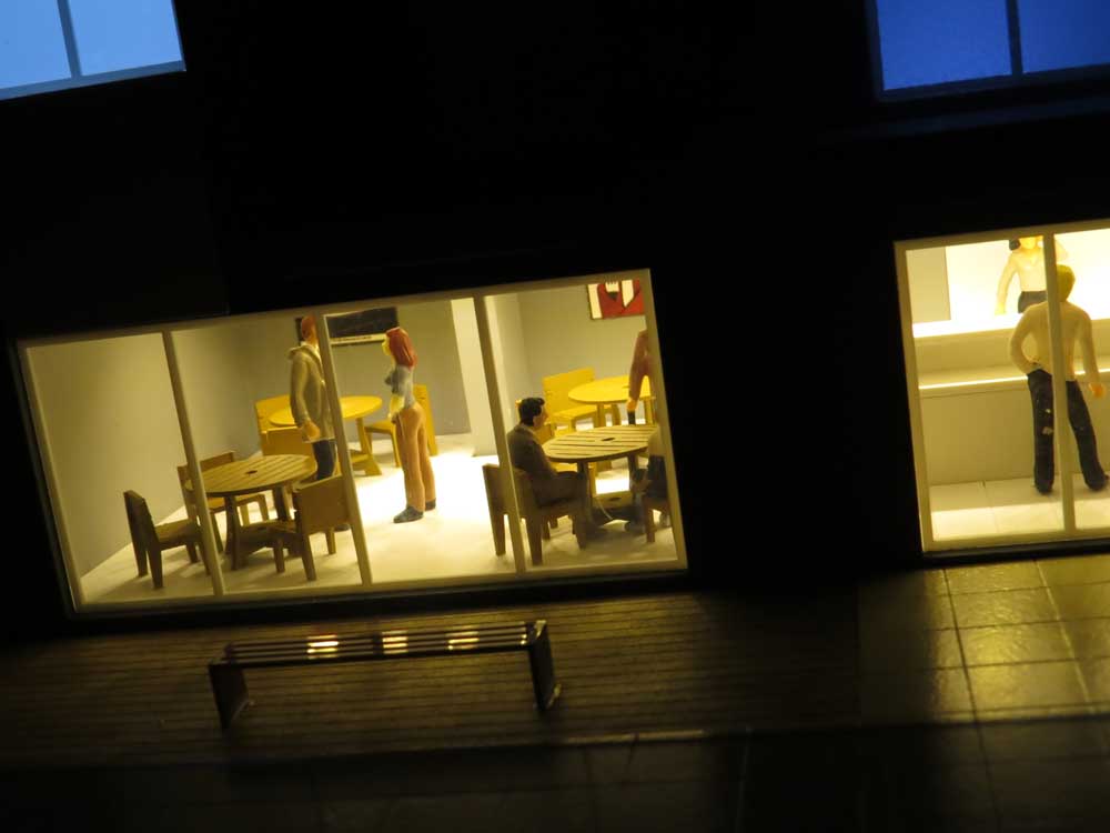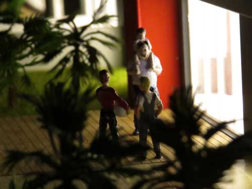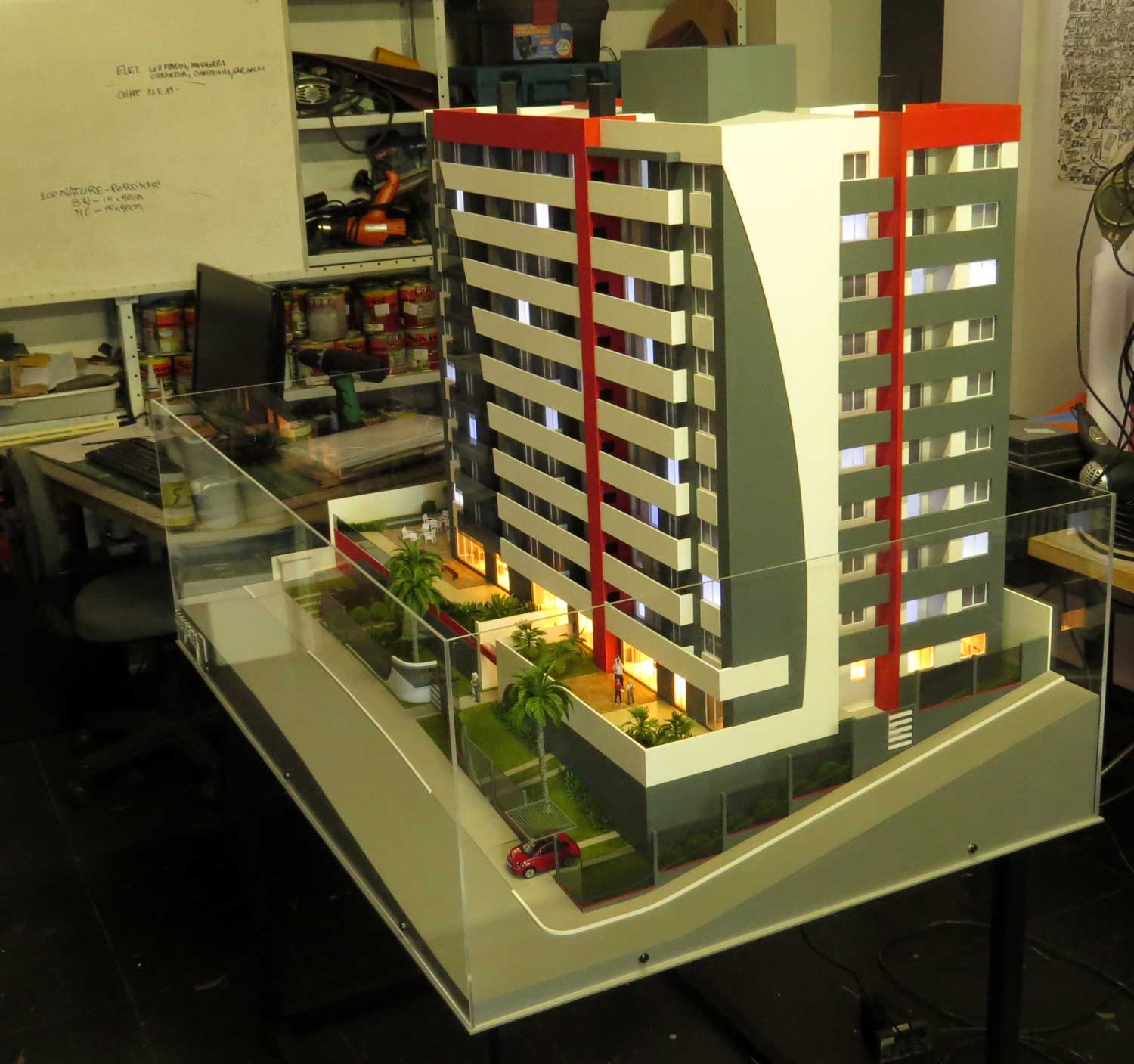1 bloco residencial, espelho dagua,brinquedos,interior condominal,iluminação por leds. Dimensões:121x81 cm Materiais empregados:acrilico,poliestireno,mdf. Base : mdf 3mm Gramado: flocagem estática Texturas : laser Vegetação:MAKETA e Injetada. Pintura:pva,automotiva Figuras: PREISER e MAKETA (Impressora 3D) Automoveis:Burago. Recorte: MAKETA. Colas: cianoacrilato,cascola.
