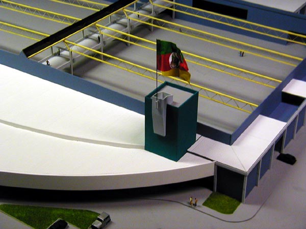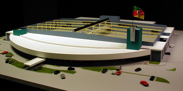 Projeto:Pedro Simch Arquitetura Predio Centro de Exposições Ciergs Dimensões:180x180 Materiais empregados:pvc,poliestireno,acrílico. Base :Estrutura aluminio e mdf Telhado:telhas poliestireno moldado (to-90) Arvores:modeladas com espuma em grão