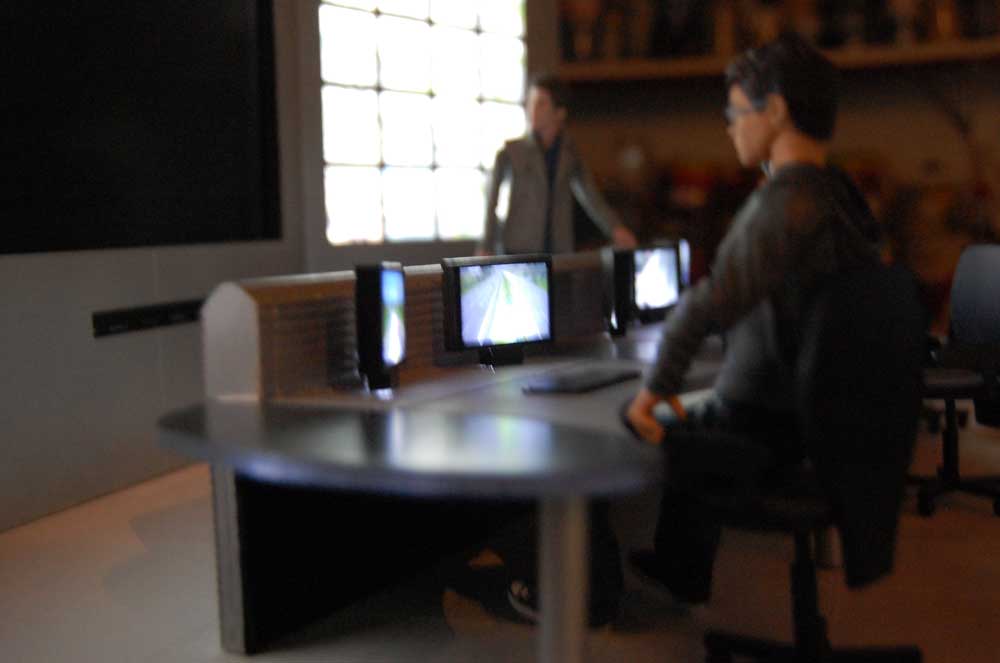 Autoestrada, sala de controle,tela LCD 11 polegadas com imagem ao vivo da autoestrada. Dimensões:70x180 cm Materiais empregados:poliestireno,pvc,acrílico,mdf Base :PVC Expandido e aço. Monitores:Acrilico e leds. Vegetação:moldada com espuma e elementos naturais. gramado:flocagem estatica