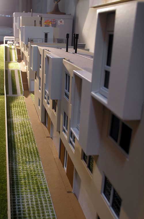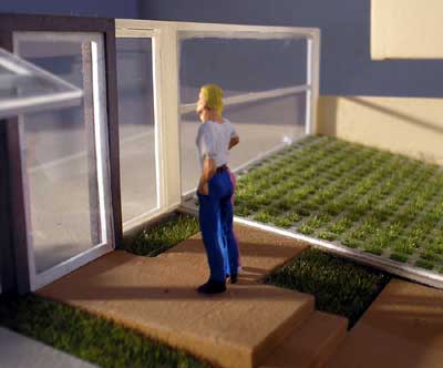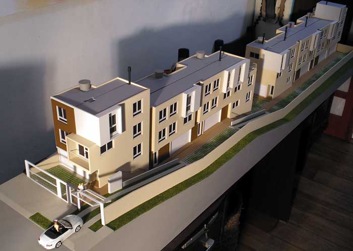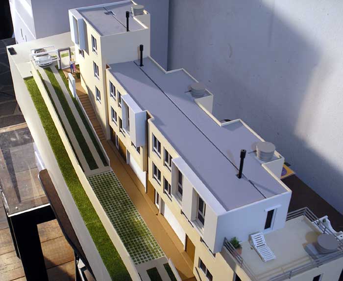 1 bloco residencial. Dimensões:30cmx200 cm Materiais empregados:pvc expandido,poliestireno,pvc,acrílico,mdf. Base :mdf Texturas moldadas:TO-100. Vegetação:moldada com espuma Mobiliario:MAKETA. Pintura:pva,automotiva Figuras:Preiser Recorte: Maketa. Colas: cianoacrilato,cascola,77.