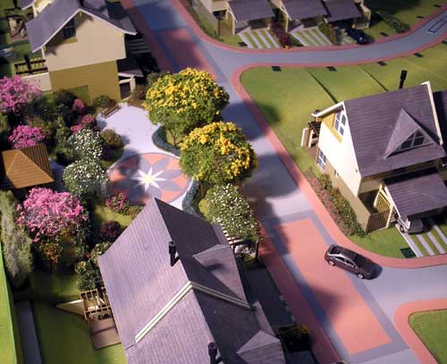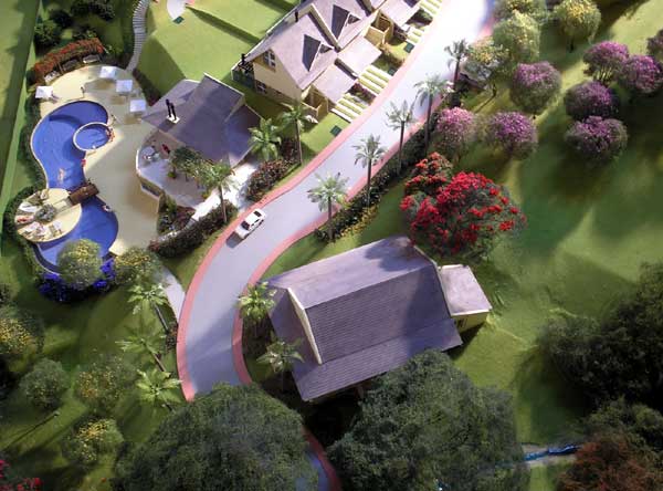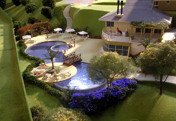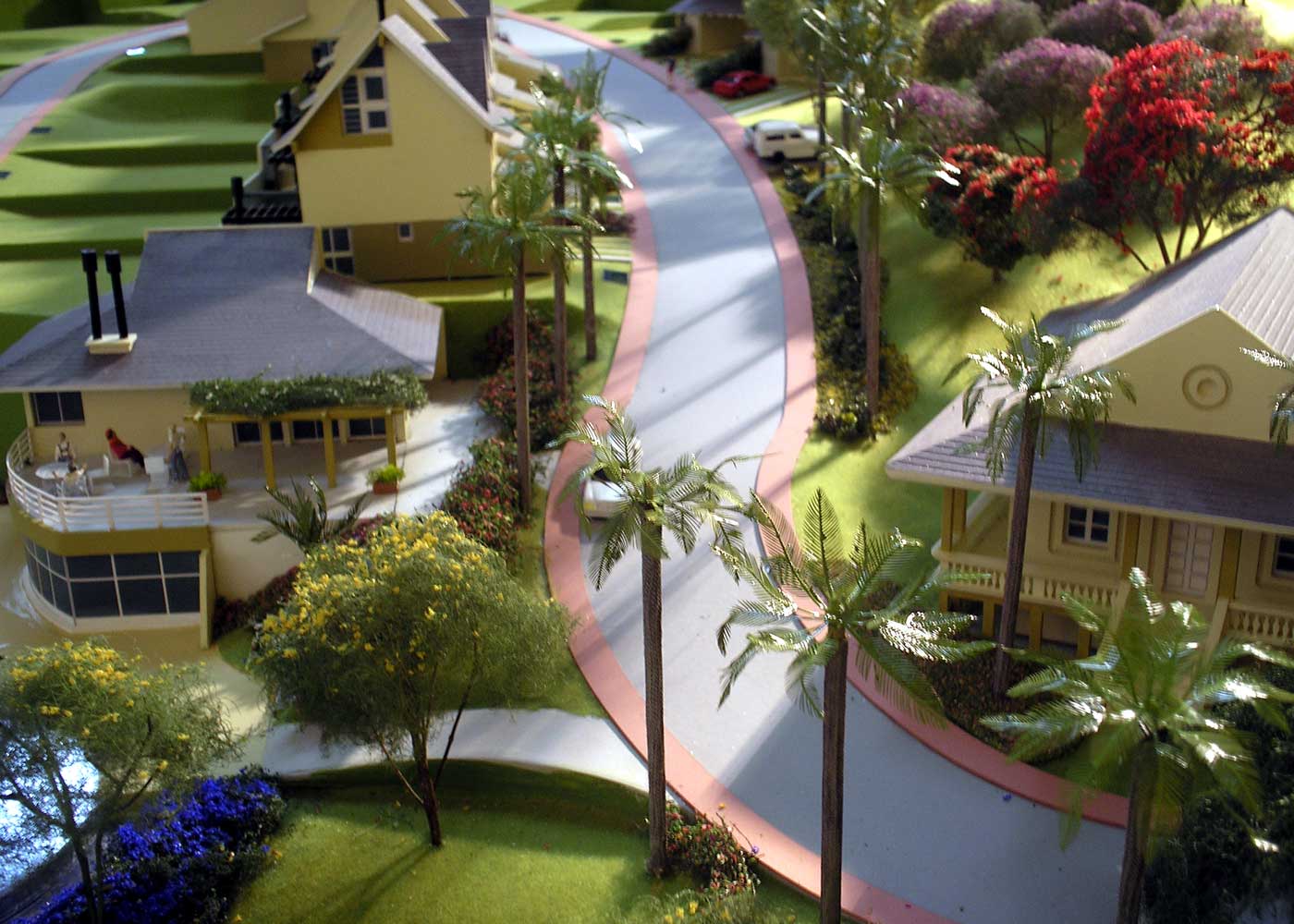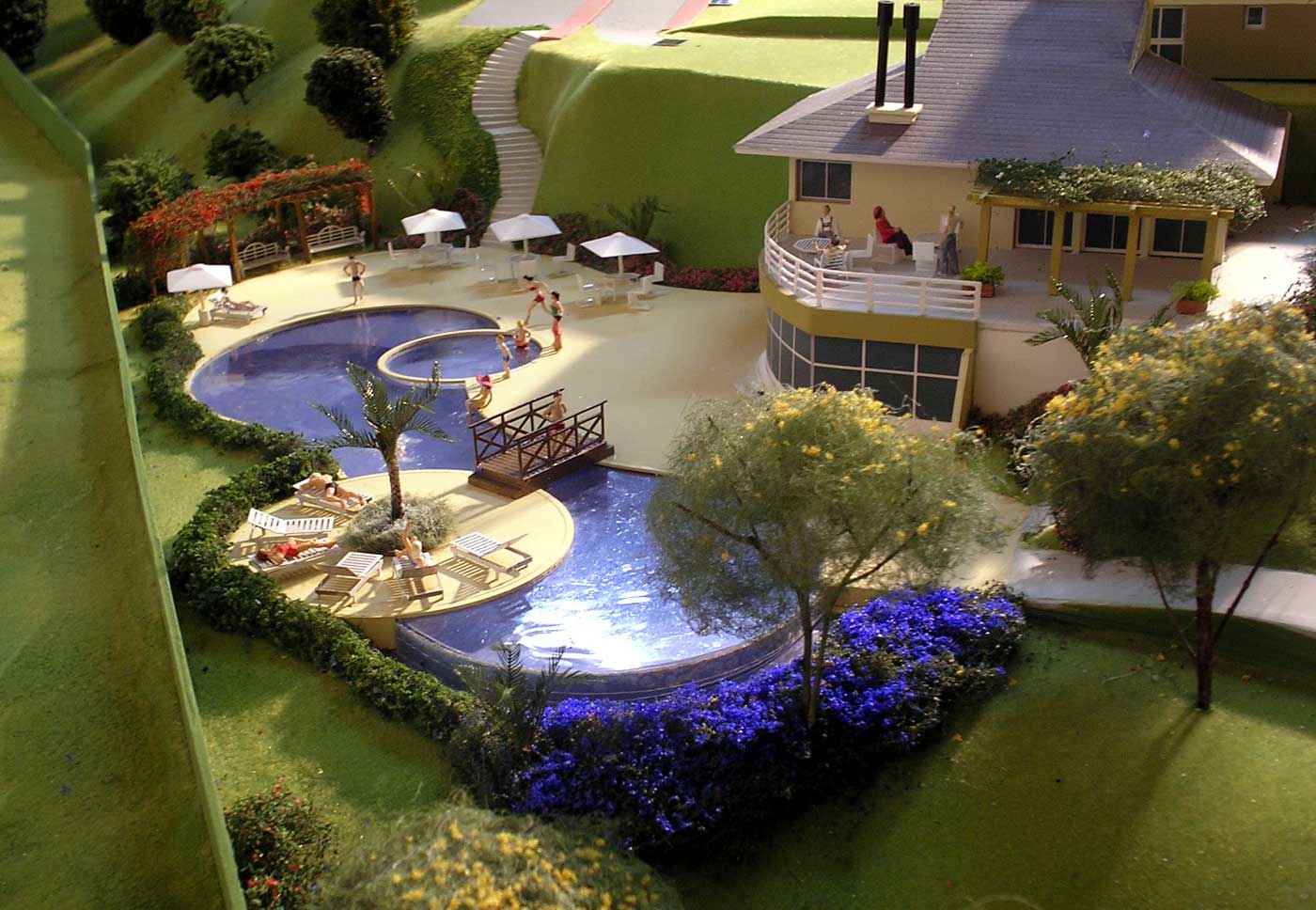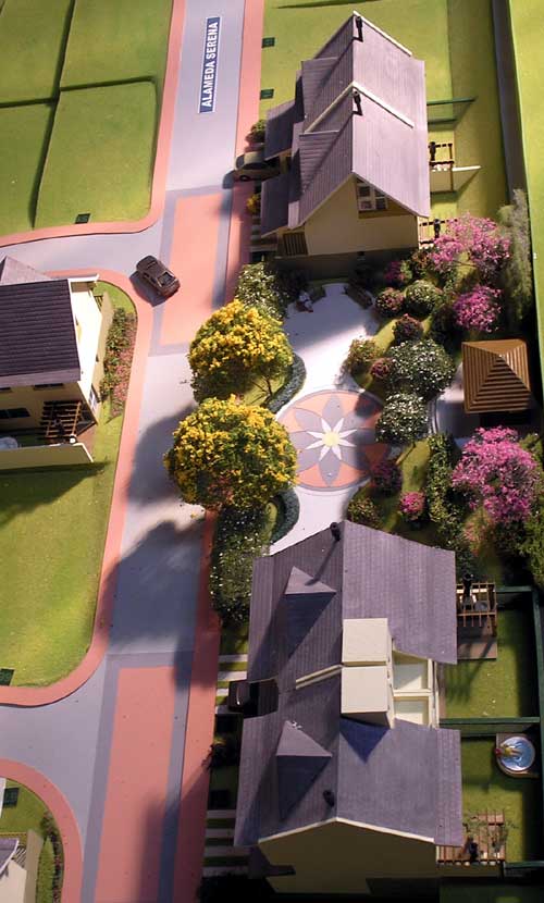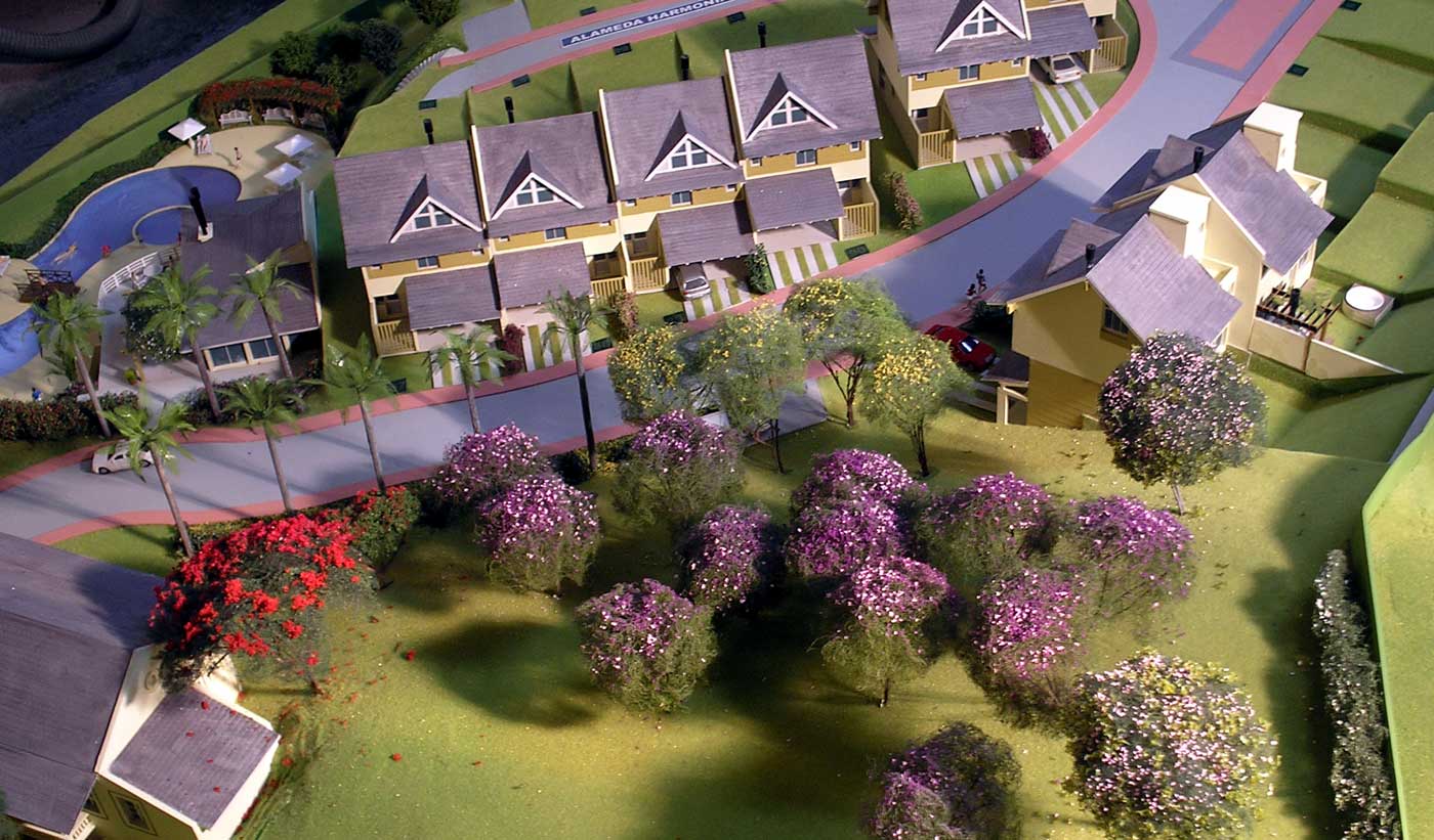 Proprietário: FamCorp Projeto: Jonas Schiaffino,arquitetos paisagismo: Takeda,arquitetos paisagistas casario,clube,administração,praças,matas,lotes. Dimensões:440x165 cm Materiais empregados:pvc expandido,poliestireno,pvc,acrílico. Base :PVC. Texturas moldadas:TP-87 (Telha plana) Agua:Resina e pvc. Mesa de aço: Serralheria Adilson. Vegetação:moldada com espuma e flocagem estática.