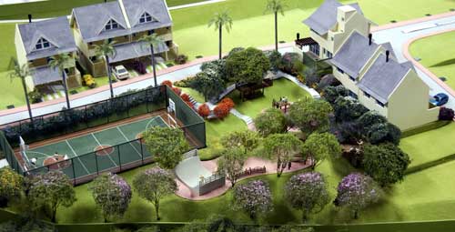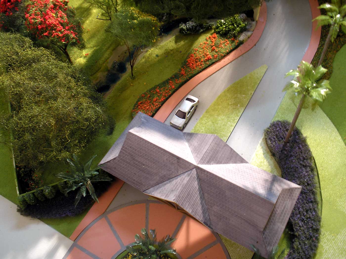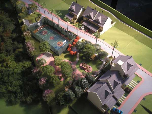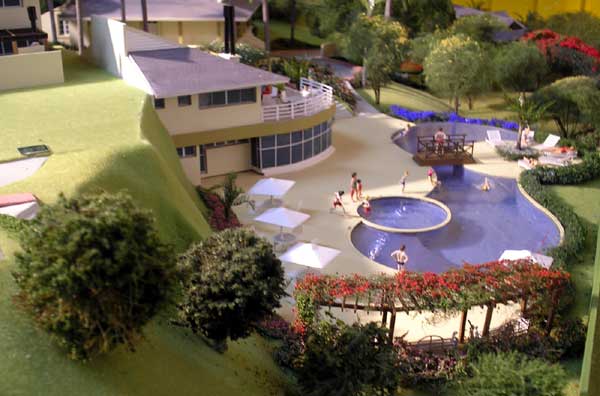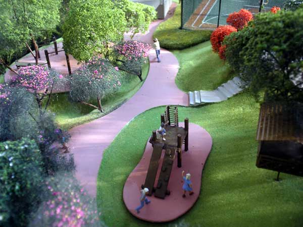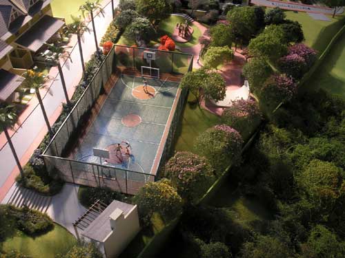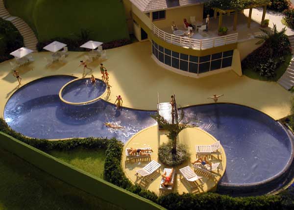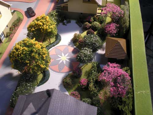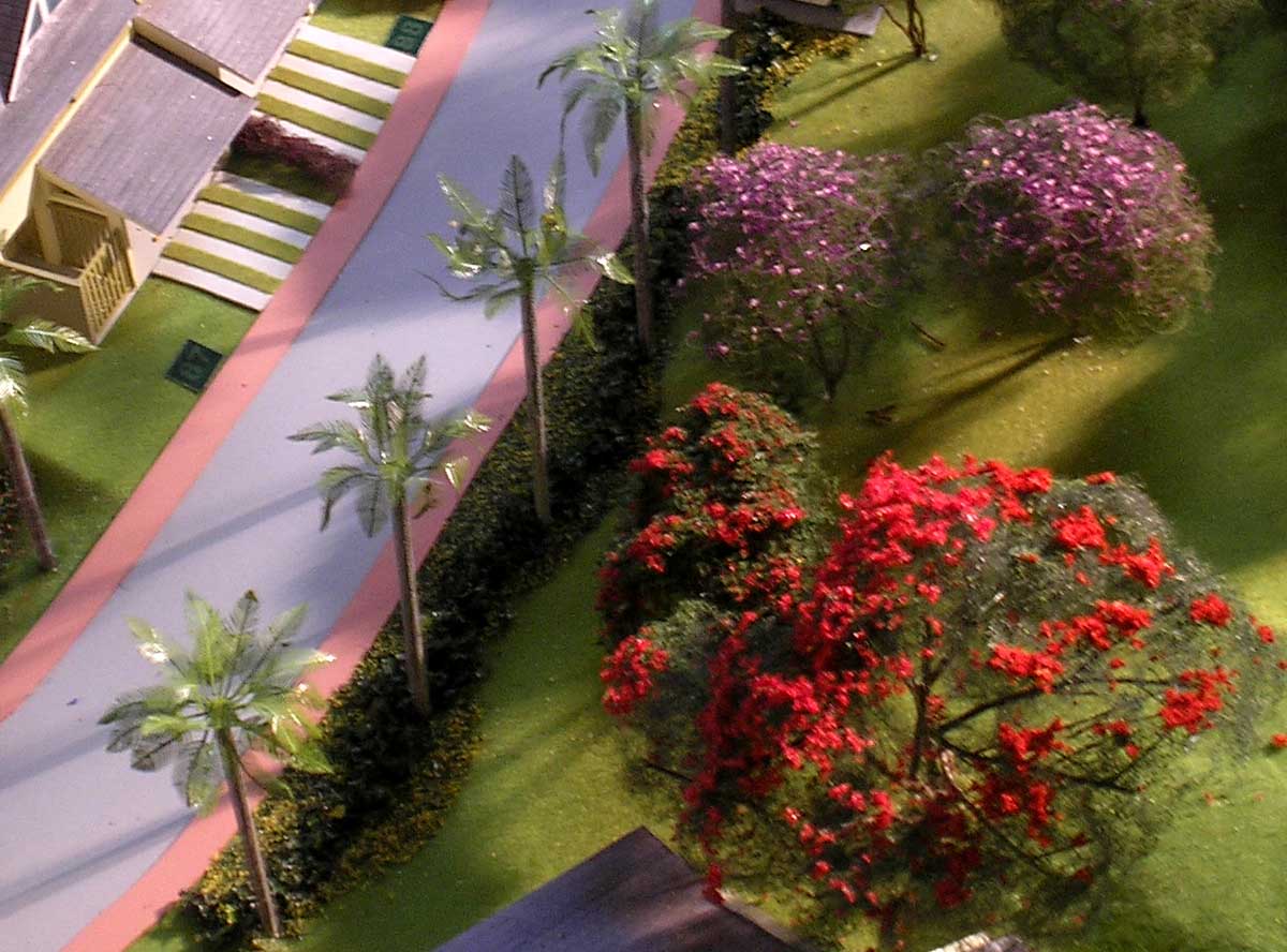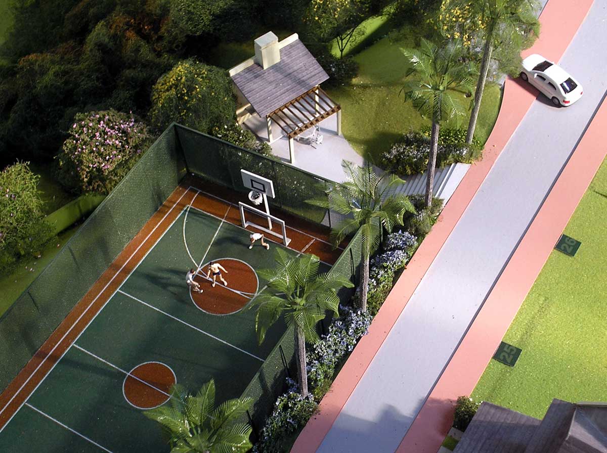 Proprietário: FamCorp Projeto: Jonas Schiaffino,arquitetos paisagismo: Takeda,arquitetos paisagistas casario,clube,administração,praças,matas,lotes. Dimensões:440x165 cm Materiais empregados:pvc expandido,poliestireno,pvc,acrílico. Base :PVC. Texturas moldadas:TP-87 (Telha plana) Agua:Resina e pvc. Mesa de aço: Serralheria Adilson. Vegetação:moldada com espuma e flocagem estática.