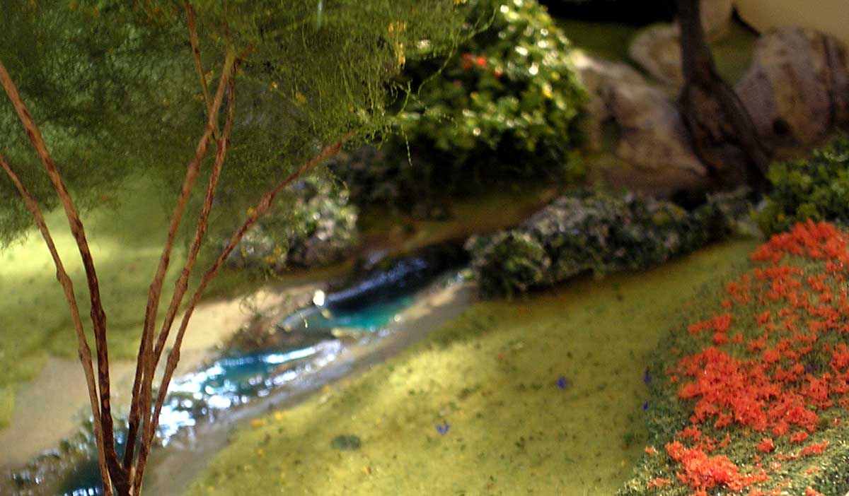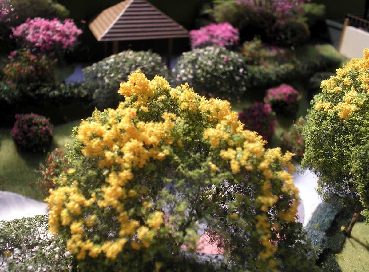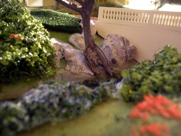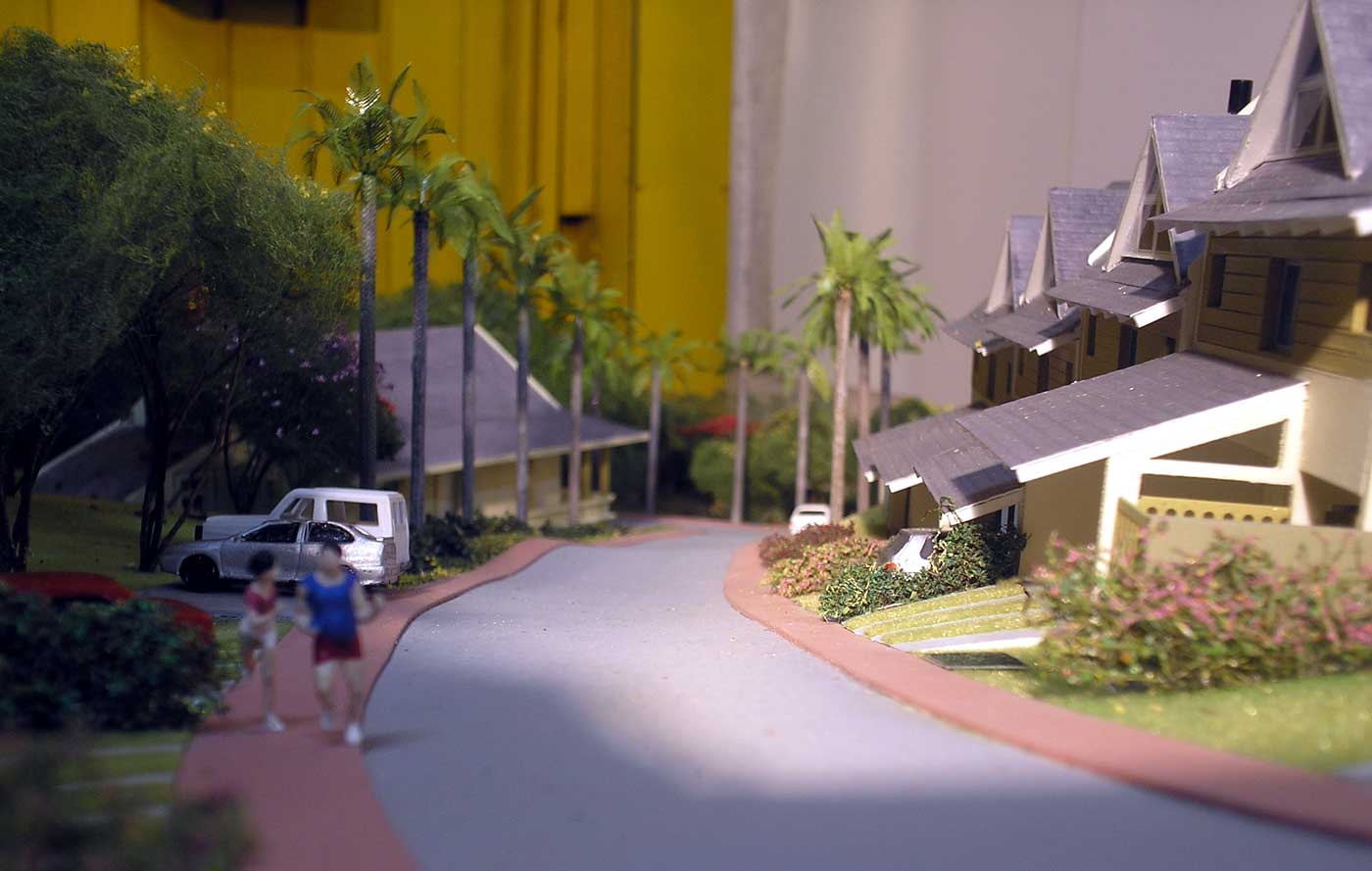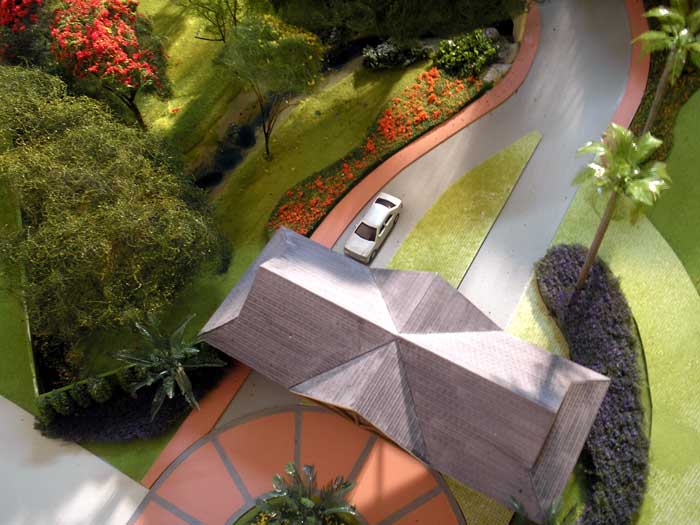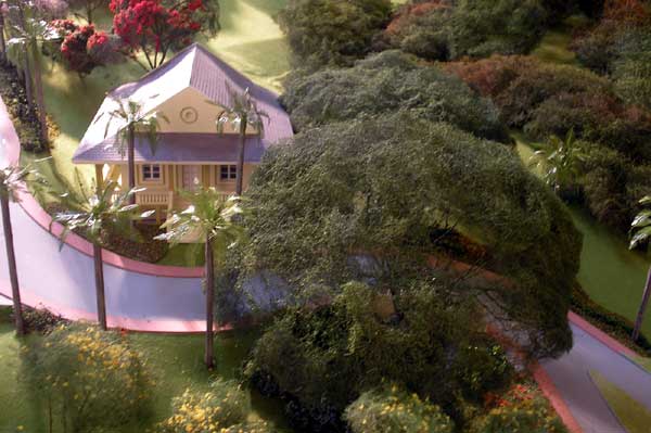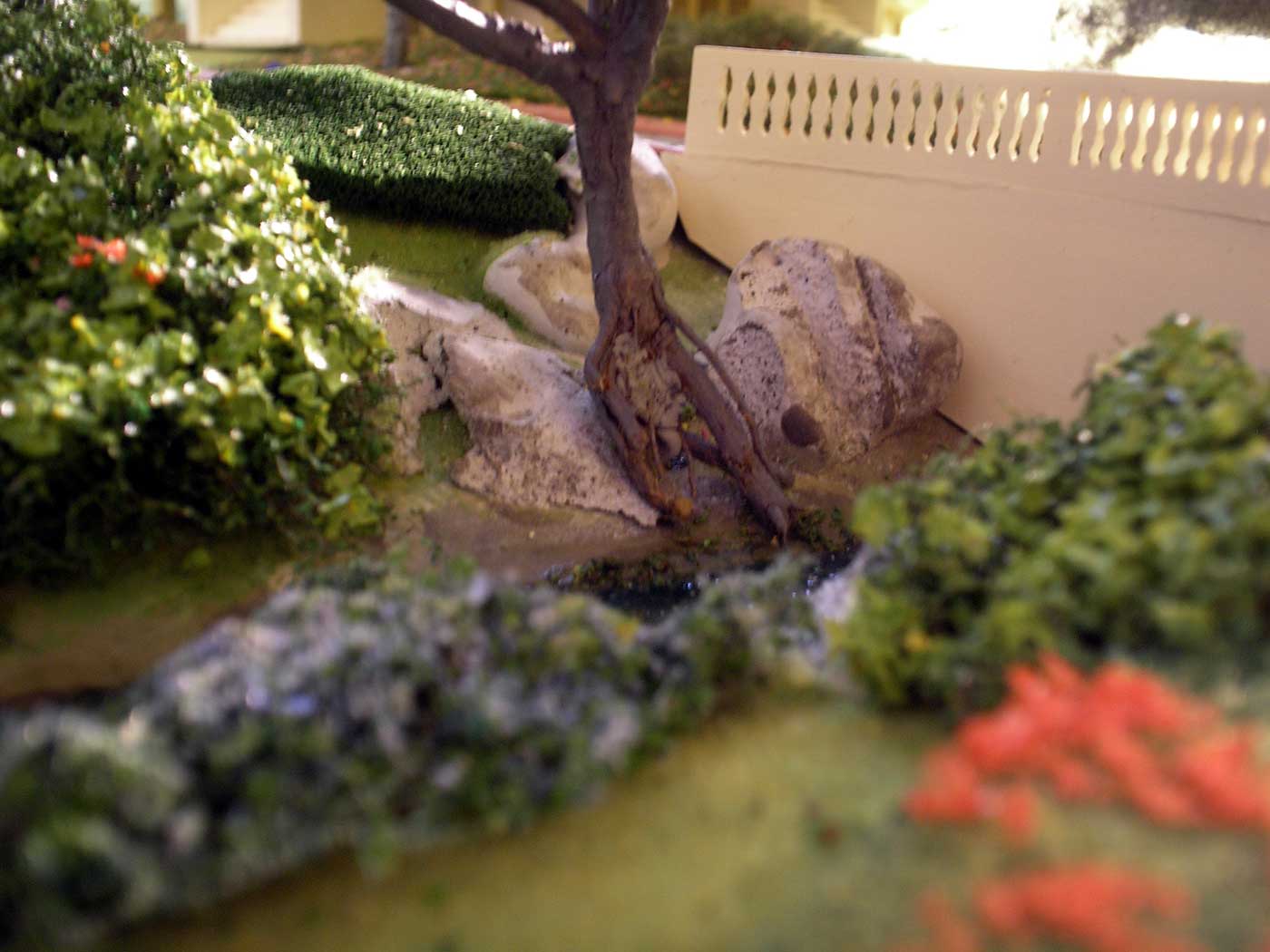 Proprietário: FamCorp Projeto: Jonas Schiaffino,arquitetos paisagismo: Takeda,arquitetos paisagistas casario,clube,administração,praças,matas,lotes. Dimensões:440x165 cm Materiais empregados:pvc expandido,poliestireno,pvc,acrílico. Base :PVC. Texturas moldadas:TP-87 (Telha plana) Agua:Resina e pvc. Mesa de aço: Serralheria Adilson. Vegetação:moldada com espuma e flocagem estática.