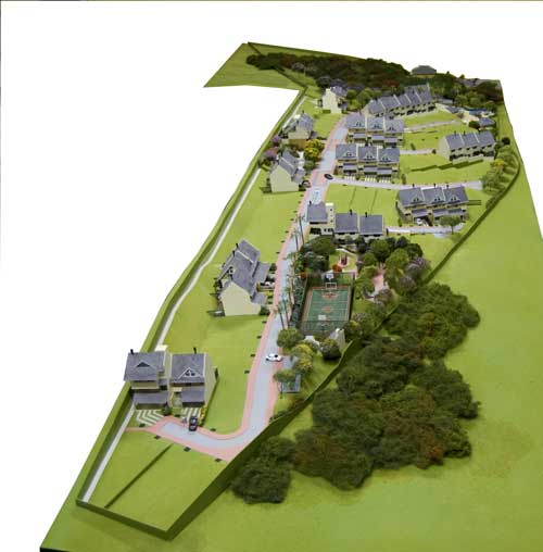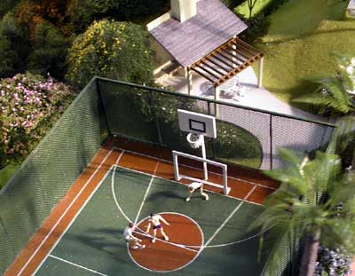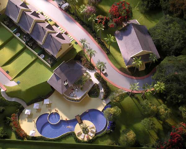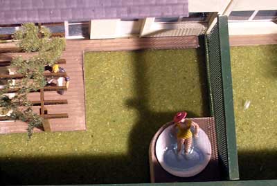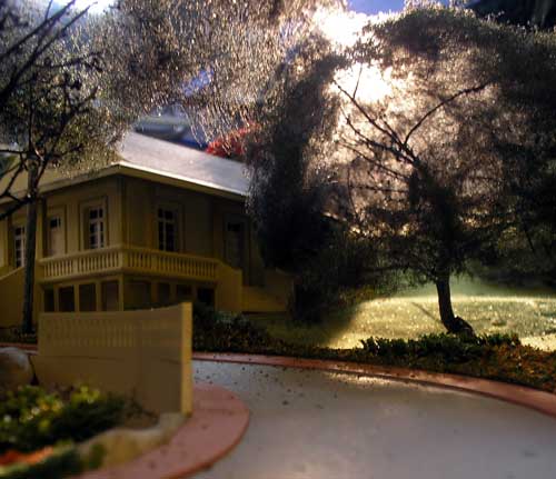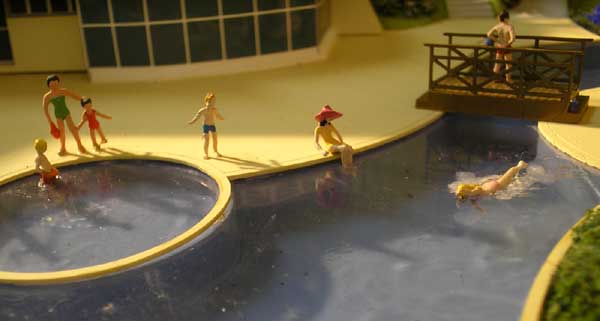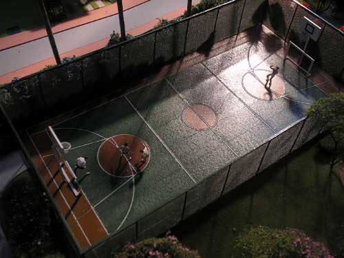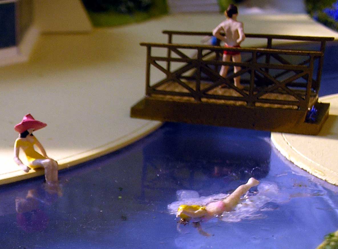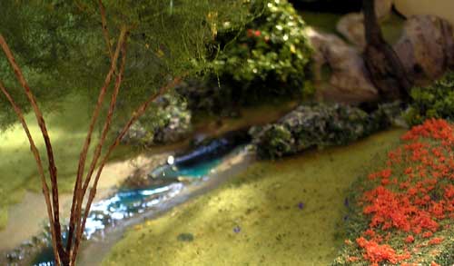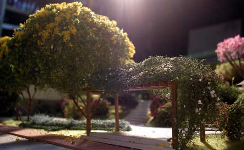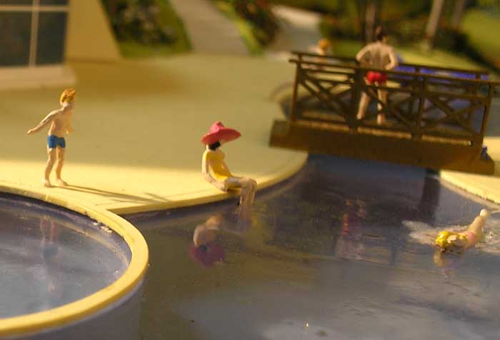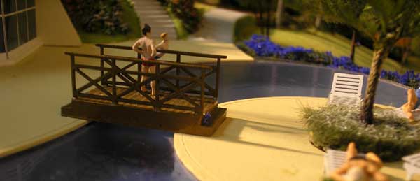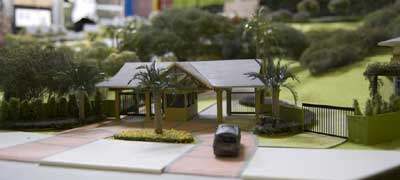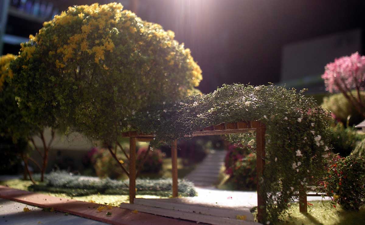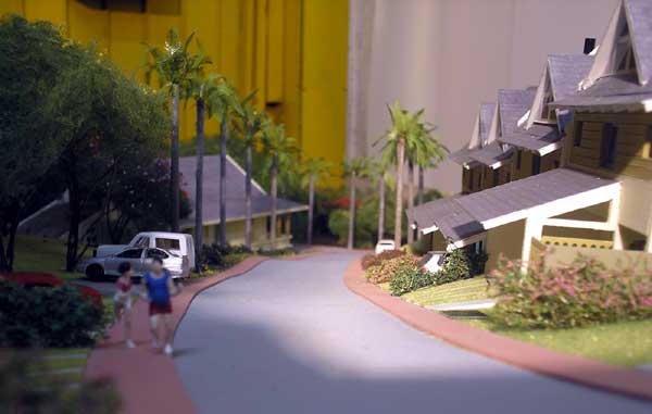 Proprietário: FamCorp Projeto: Jonas Schiaffino,arquitetos paisagismo: Takeda,arquitetos paisagistas casario,clube,administração,praças,matas,lotes. Dimensões:440x165 cm Materiais empregados:pvc expandido,poliestireno,pvc,acrílico. Base :PVC. Texturas moldadas:TP-87 (Telha plana) Agua:Resina e pvc. Mesa de aço: Serralheria Adilson. Vegetação:moldada com espuma e flocagem estática.
