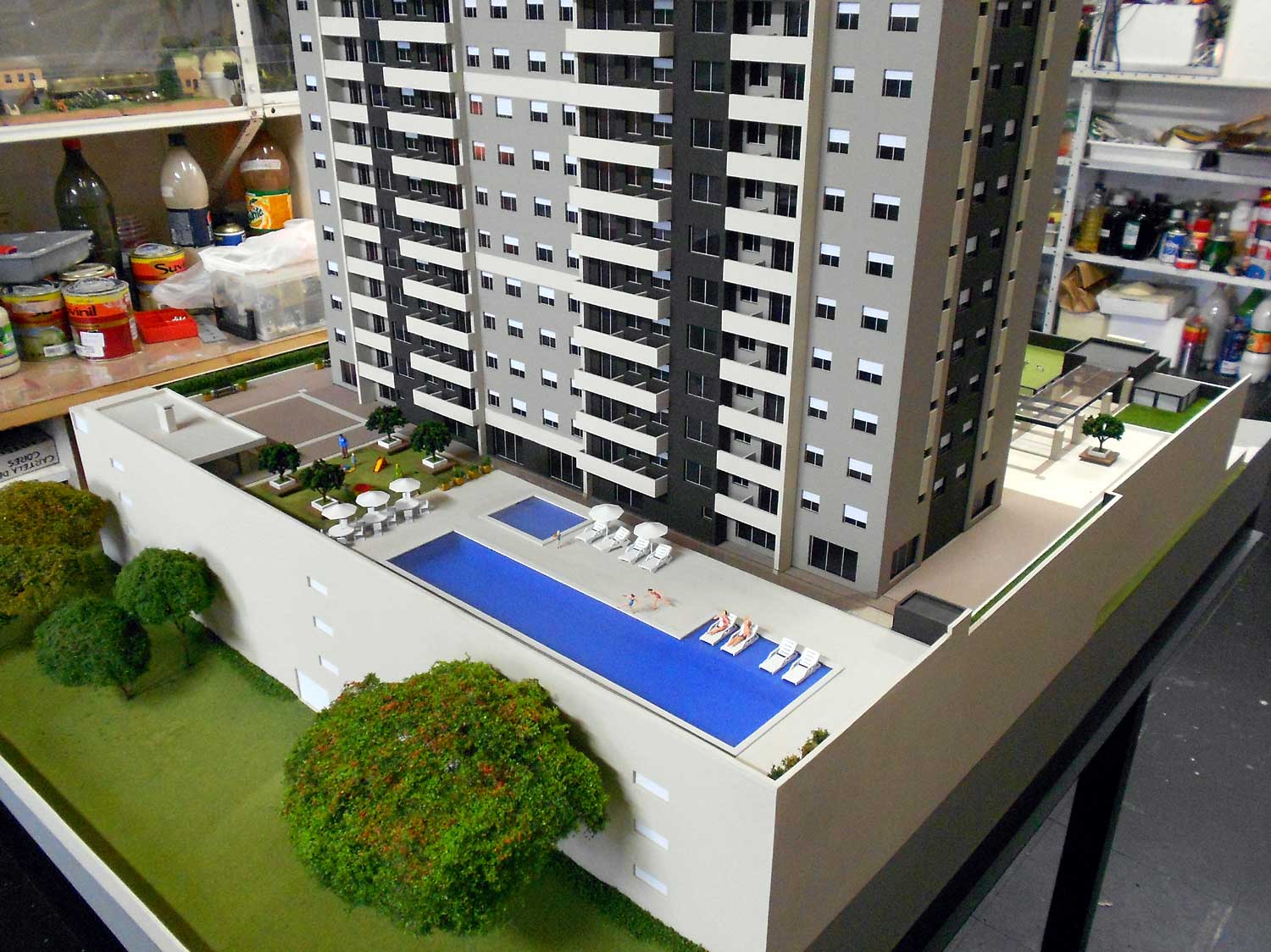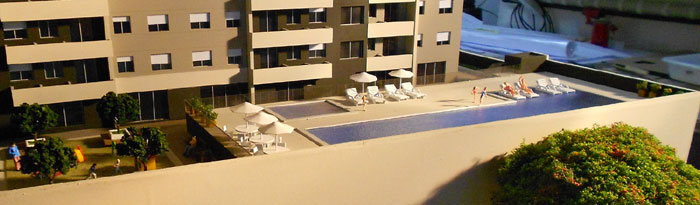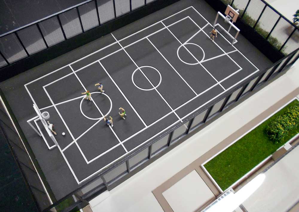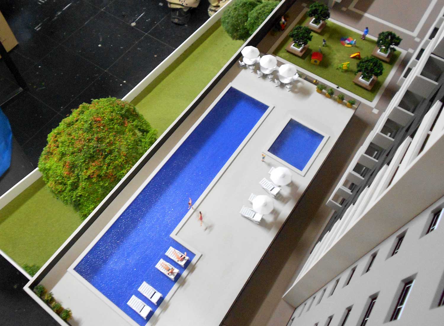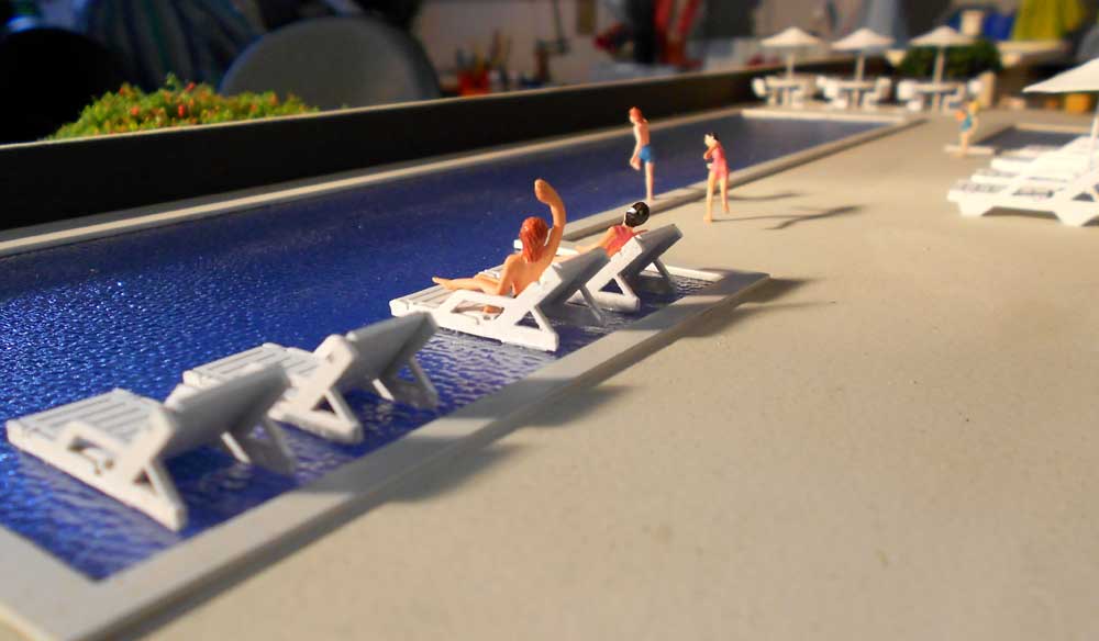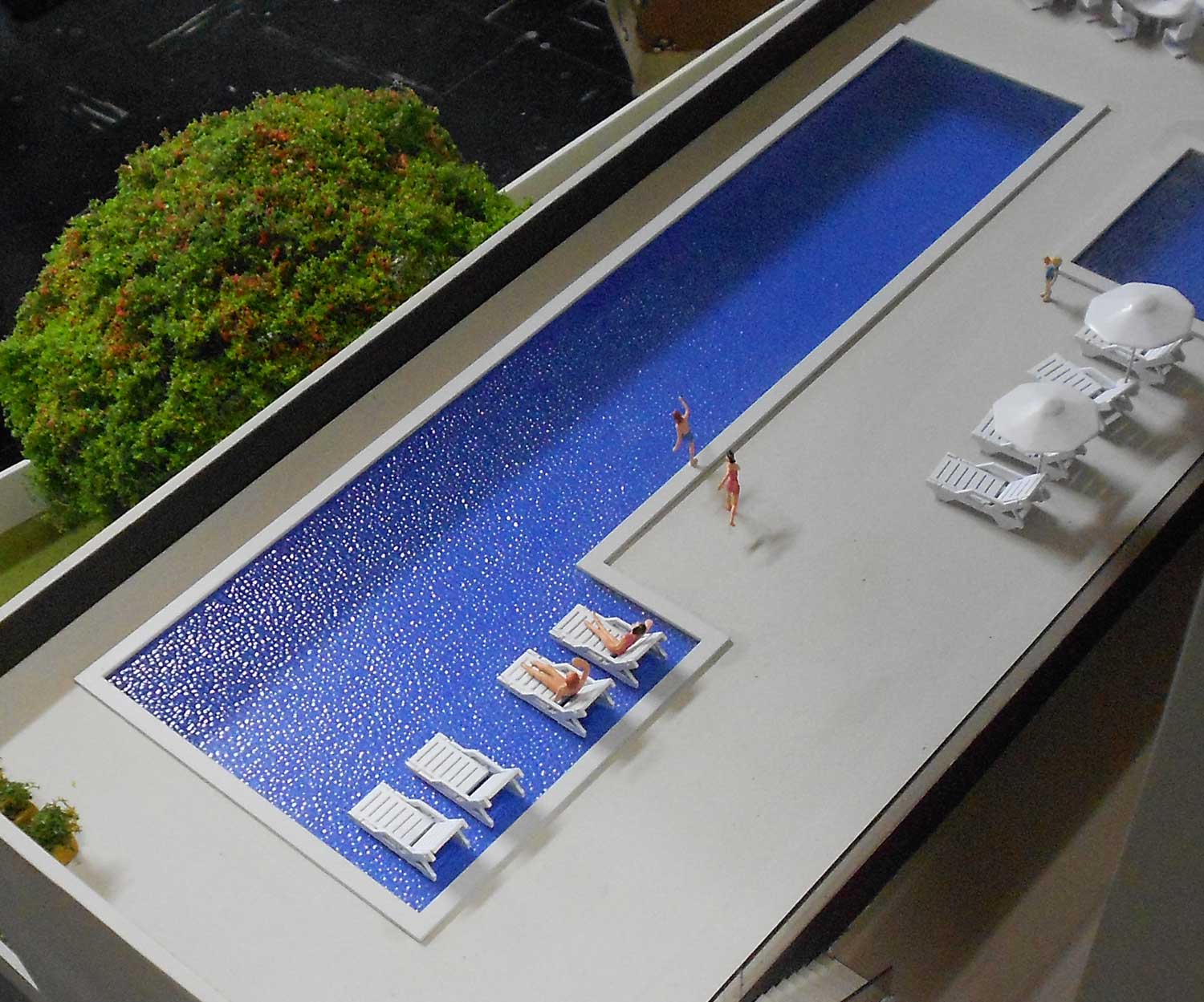 1 maquete,piscinas,area de jogos. Dimensões:140x90 cm Materiais empregados:pvc expandido,poliestireno,pvc,acrílico,mdf. Base :Aço e mdf Gramado: flocagem estática Texturas moldadas:TO100. Vegetação:injetados, palmeiras PAI. Mobiliario:MAKETA.