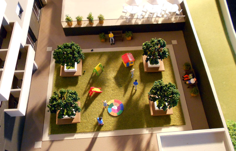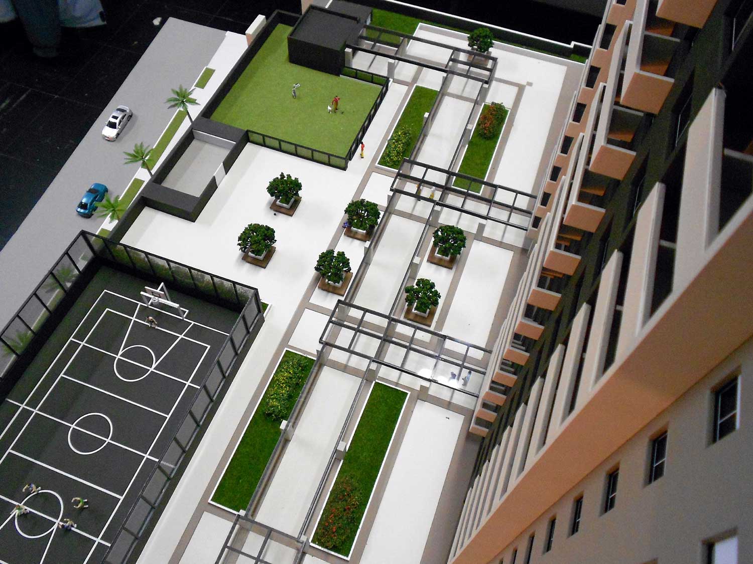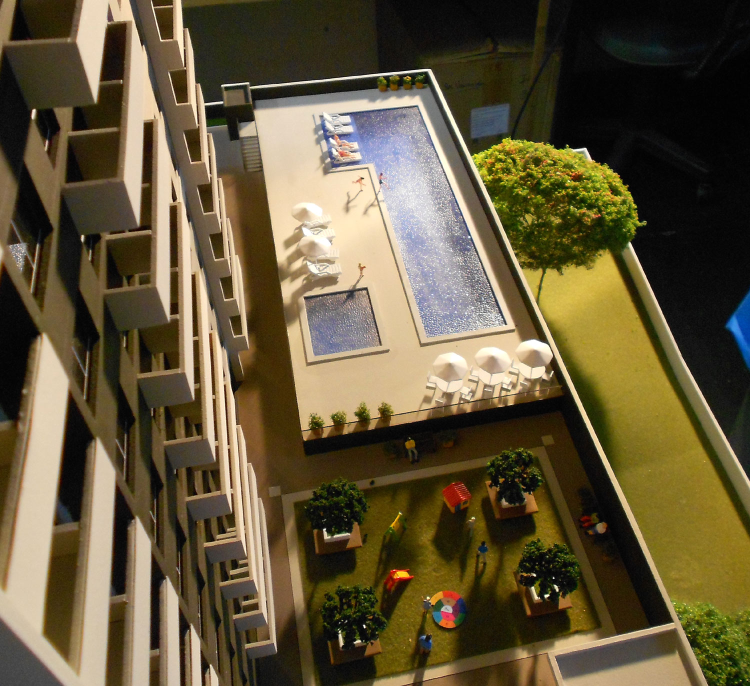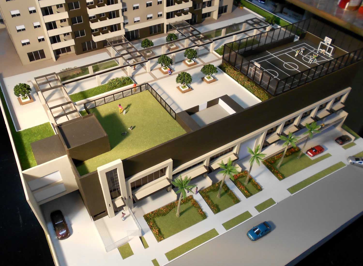 1 maquete,piscinas,area de jogos. Dimensões:140x90 cm Materiais empregados:pvc expandido,poliestireno,pvc,acrílico,mdf. Base :Aço e mdf Gramado: flocagem estática Texturas moldadas:TO100. Vegetação:injetados, palmeiras PAI. Mobiliario:MAKETA.