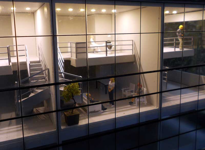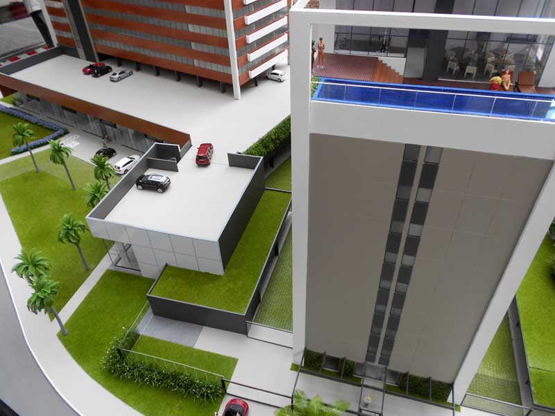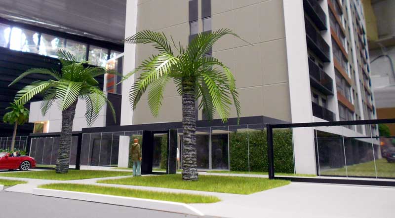 1 bloco residencial ,1 bloco comercial,lojas, estacionamentos,piscina,iluminação por leds 12 v. Dimensões:275x175 cm Materiais empregados:acrilico,poliestireno,pvc,mdf. Base : mdf sobre estrutura em aço. Gramado: flocagem estática Texturas moldadas:TO100,PN100,PQ50. Vegetação:injetados, palmeiras PAI. Mobiliario:MAKETA. Pintura:pva,automotiva