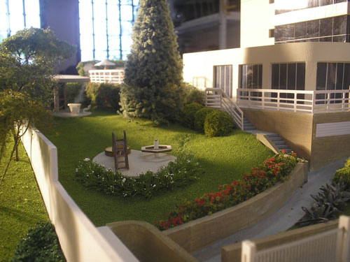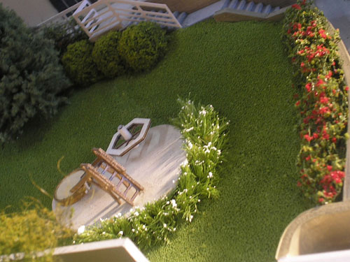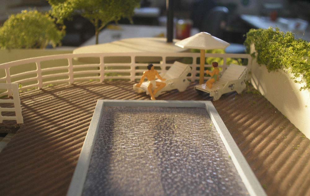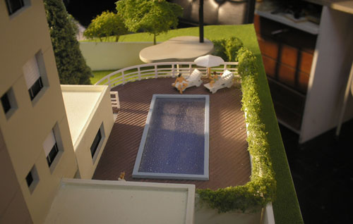 Proprietario:CKS Projeto: Raul Milani,arquitetos 1 blocos residencial,piscina,brinquedos,churrasqueira Dimensões:70x70 cm Materiais empregados:poliestireno,pvc,acrílico Base :PVC. Telhas:TI-72 Tampo: Artplast Agua:PN-100. Vegetação:moldada com espuma e elementos naturais.
