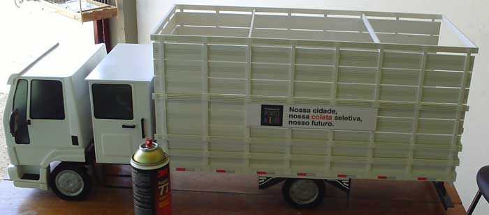 Caminhão de coleta seletiva do lixo. Dimensões:30x90 cm Materiais empregados:pvc expandido,poliestireno,pvc,acrílico. Base :Mdf