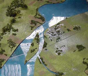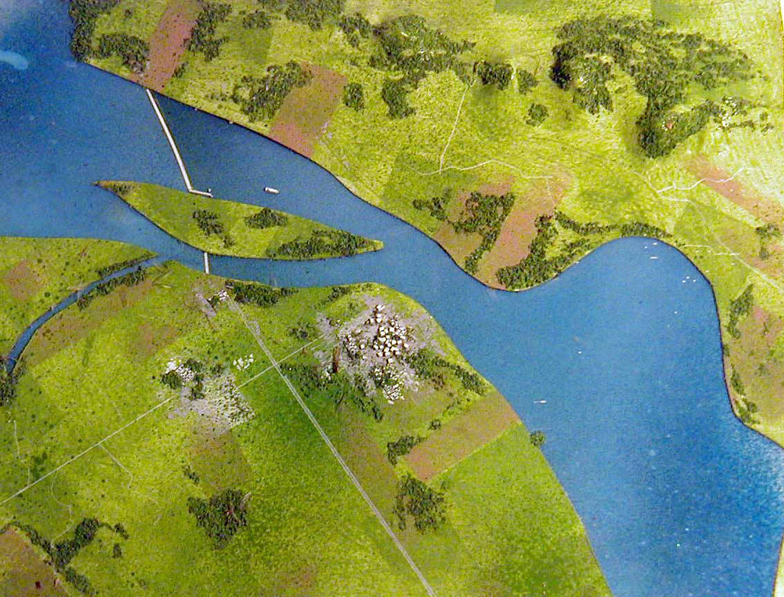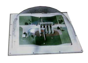 Maquete represa elaborada em poliestireno para Consorcio Magna Montor Coberta com tampo de acrilico tipo bolha Metacril.