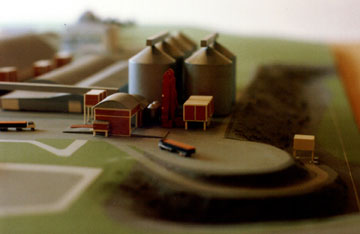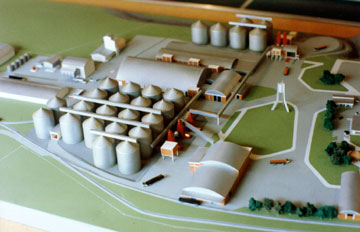Maquete cooperativa Alegretense Escala 1:250 Base madeira Tampo de acrílico tipo bolha Metacril Prédios poliestireno telhas moldadas de poliestireno (TM 100) Depósitos de madeira torneada Arvores de espuma pintada Caminhões de acrílico