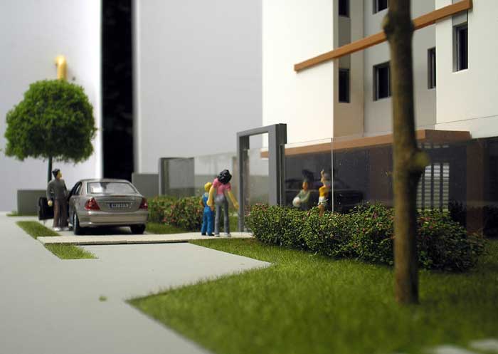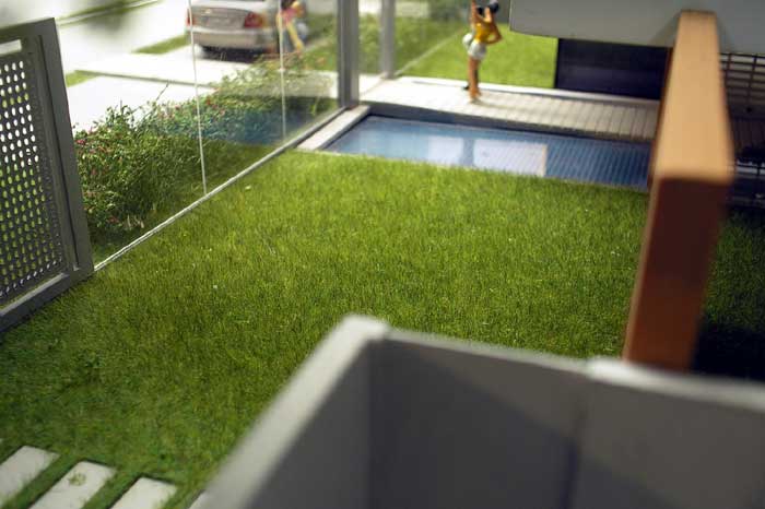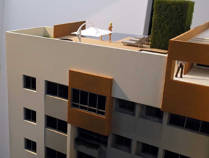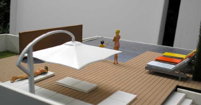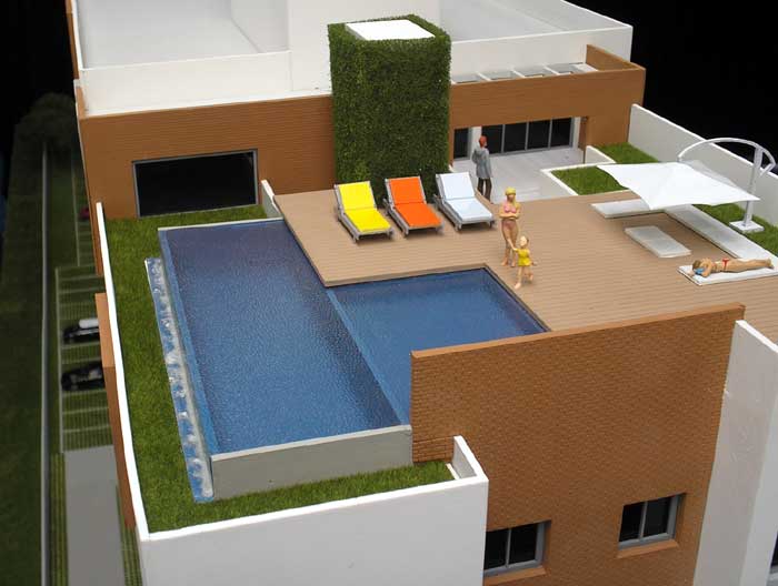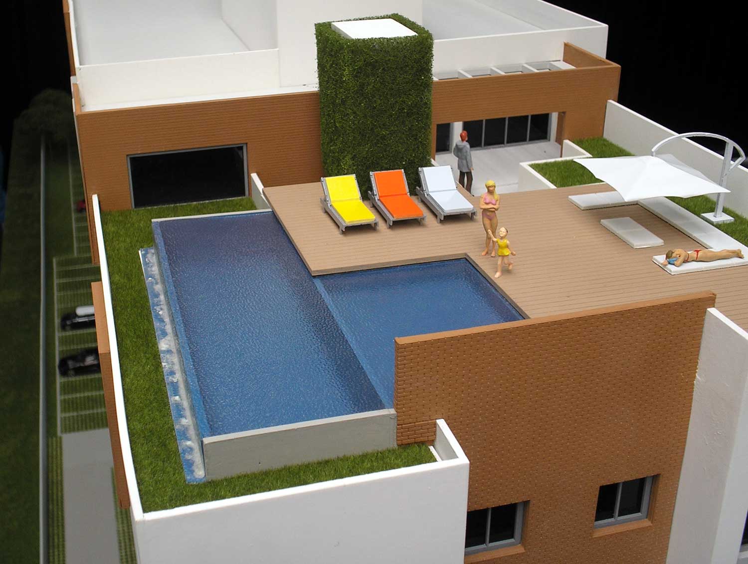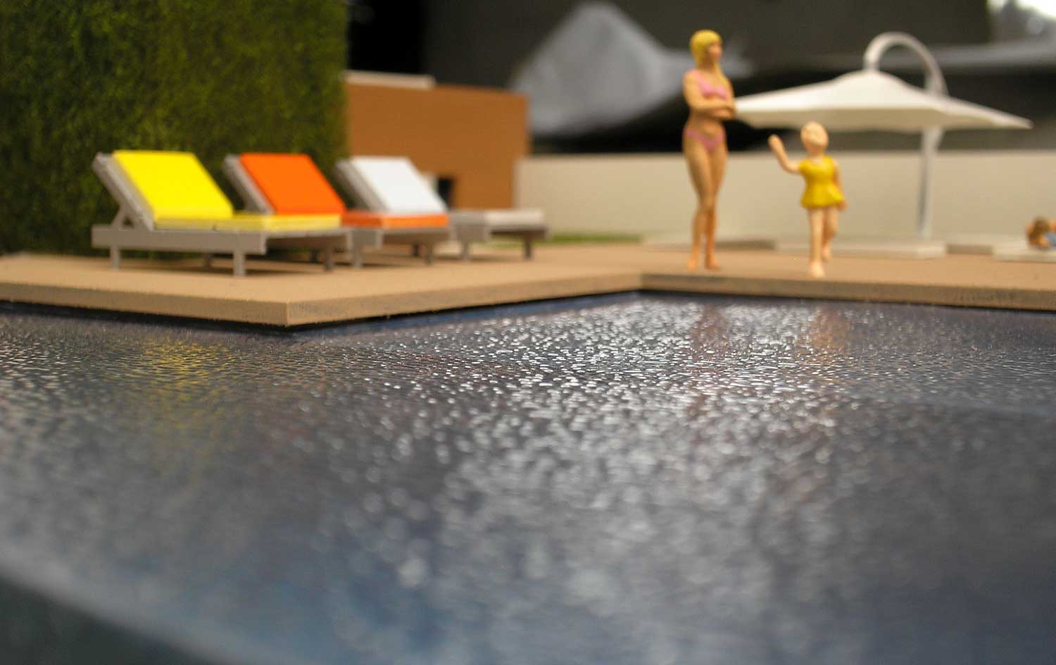 1 bloco residencial,piscina,interior iluminado com leds. Dimensões:80x170 cm Materiais empregados:pvc expandido,poliestireno,pvc,acrílico,mdf. Base :mdf e aço Texturas moldadas:TO-100. Agua:PN-100 Mesa de aço: Serralheria Adilson. Vegetação:moldada com espuma, palmeiras PAI. Mobiliario:MAKETA. Pintura:pva,automotiva Figuras:Preiser Recorte: Prolaser e Maketa. Colas: cianoacrilato,cascola,77.