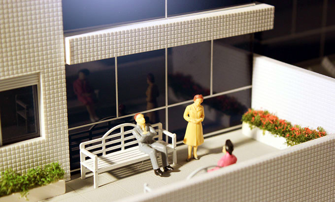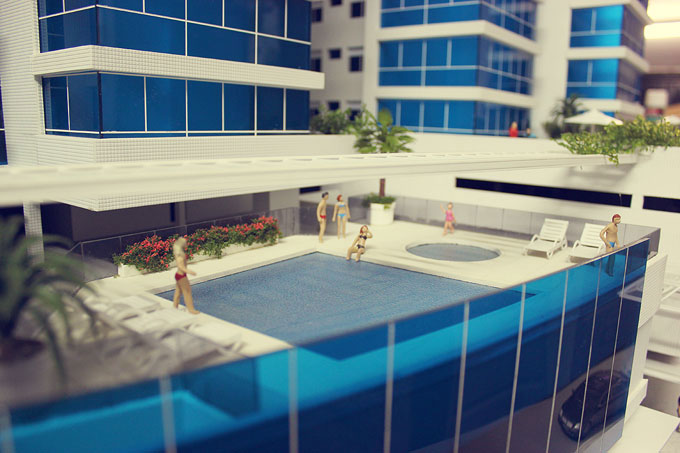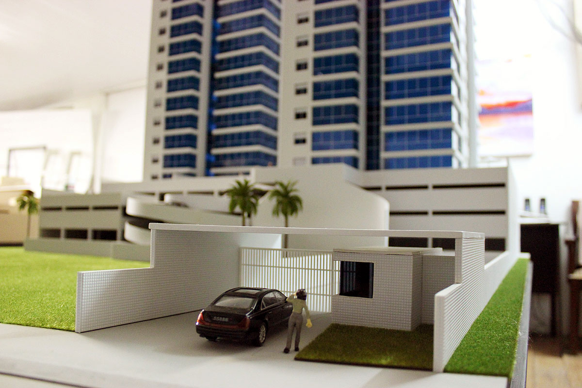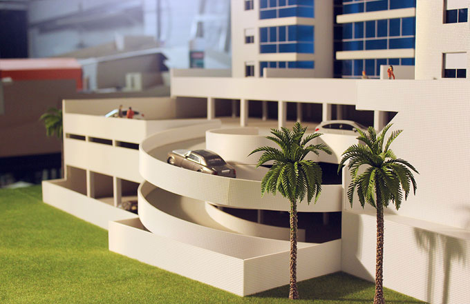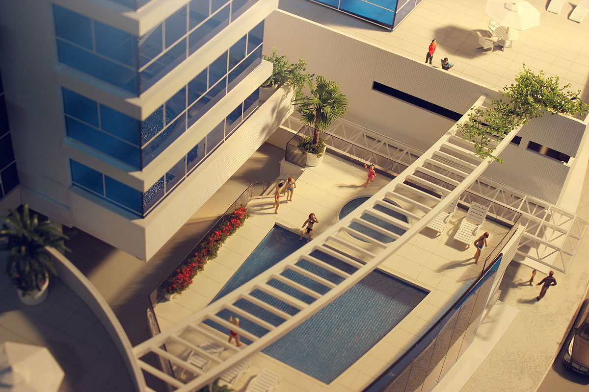 2 blocos residenciais,lojas,estacionamentos,piscinas,area de jogos,churrasqueiras. Dimensões:210x150 cm Materiais empregados:acrilico,poliestireno,pvc,mdf. Base :Aço e mdf Gramado: flocagem estática Texturas moldadas:TO100,PN100,PQ50. Vegetação:injetados, palmeiras PAI. Mobiliario:MAKETA.