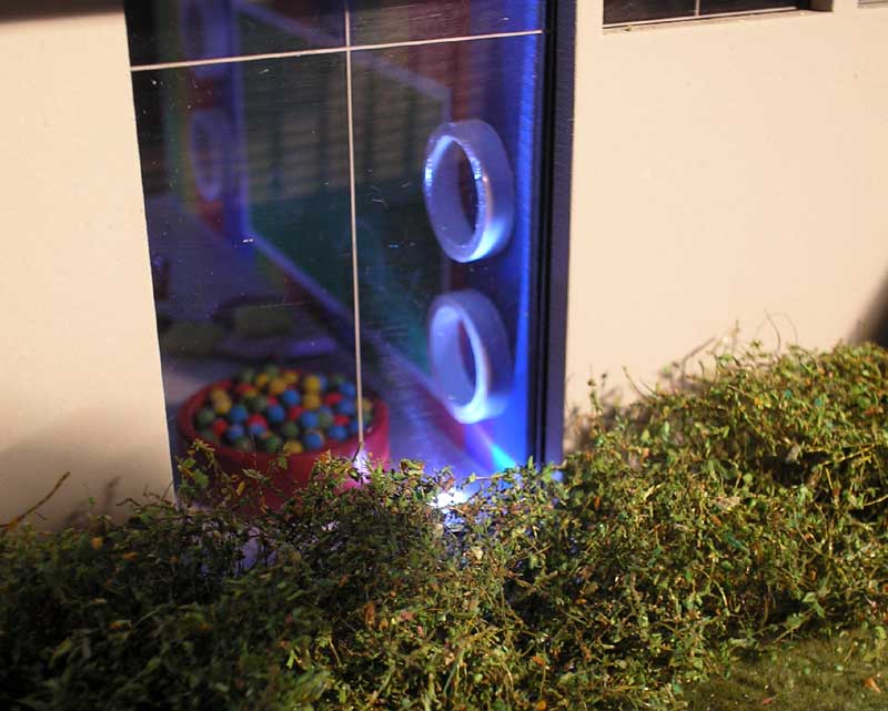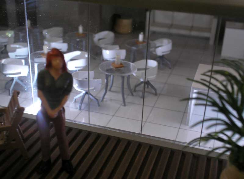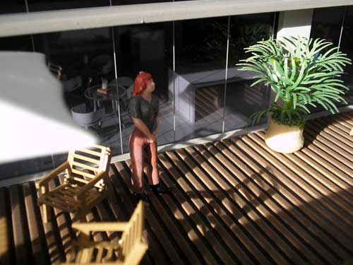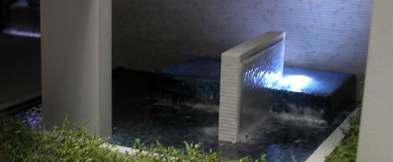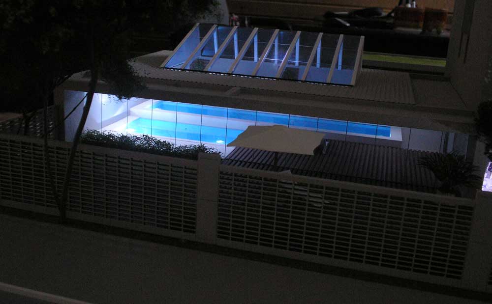 Iluminação: 35 leds Dimensões:91x181 cm Materiais empregados:poliestireno,pvc,mdf. Base :aço,mdf Agua: Acrilico Pastilhas piscina:PQ-100 Telhas:TO-43 Deck:LM-43 Vegetação:moldada com espuma e elementos naturais.